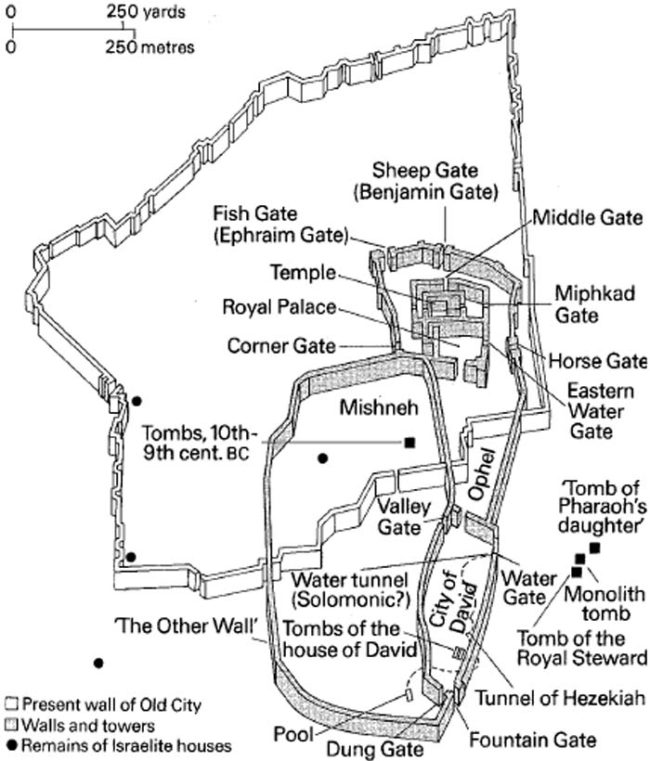 By this map, the fish gate is not near the city of David or the Gihon (which sits directly below and east of the City of David). And if Manasseh did build a gate from the Gihon to the Fish Gate as depicted in this map, there would be no need to “compass Ophel” because it would be properly protected. The modern conception of the temple’s location renders the Scripture above inaccurate (which of course cannot be the case), because it wrongly places the Temple farther north rather than on Ophel, on the north side of the City of David. Clearly the The Dome of Rock location is incorrect and has no Biblical confirmation whatsoever.